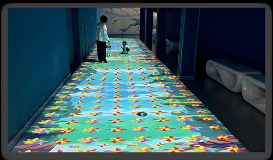 孩子们在地面上追逐、跳跃,脚下的动画随之变化,这片区域成为整个海底世界中