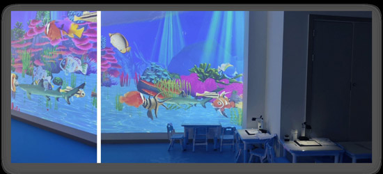 在10米×3米的墙面上,多台奥图码激光投影机正投展示互动涂鸦内容。配备两套互动扫描系统与多套绘画桌椅,这里成为了